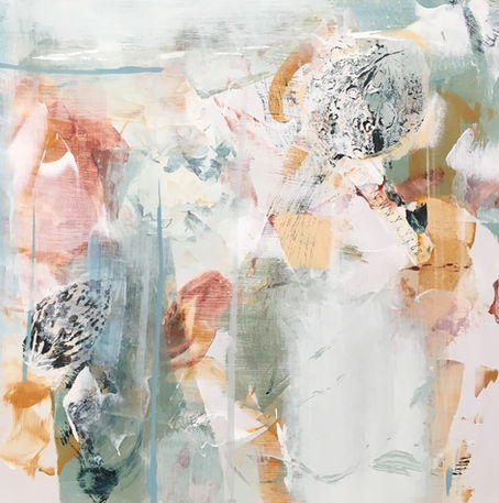 My works develop their own life as I paint them, generally, I have an intention in mind but I allow free rein with my materials and processes and enjoy seeing where it takes me. To me, painting is about the joy that I get, this feeling can then communicate with the viewer. I prefer to work on board as I enjoy the way in which the paint glides over the surface rather than sinking into a canvas, I also use scrapers and spatulas to create layers, allowing the underneath to peek out, creating a sense of depth and spatiality.